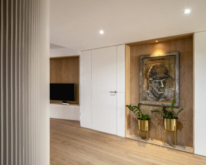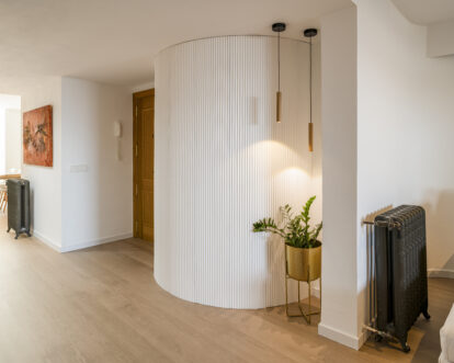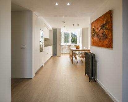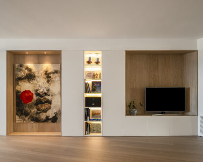 La nueva distribución se planteó con el objetivo de crear un espacio más abierto y fluido, integrando cocina, comedor y salón en un único ambiente. El elemento que articula y unifica estos tres espacios es una pieza de pared-mobiliario que cumple distintas funciones: almacenaje, soporte expositivo para cuadros y acceso a la zona de dormitorios. Su diseño aporta continuidad y coherencia al conjunto, reforzando la sensación de amplitud del espacio.