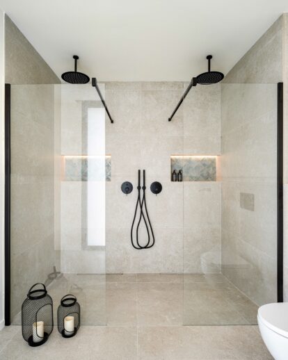 La planta superior alberga tres dormitorios dobles. La habitación principal dispone de baño en suite y dos vestidores, mientras que los otros dos dormitorios cuentan con vestidor propio y comparten un baño.
